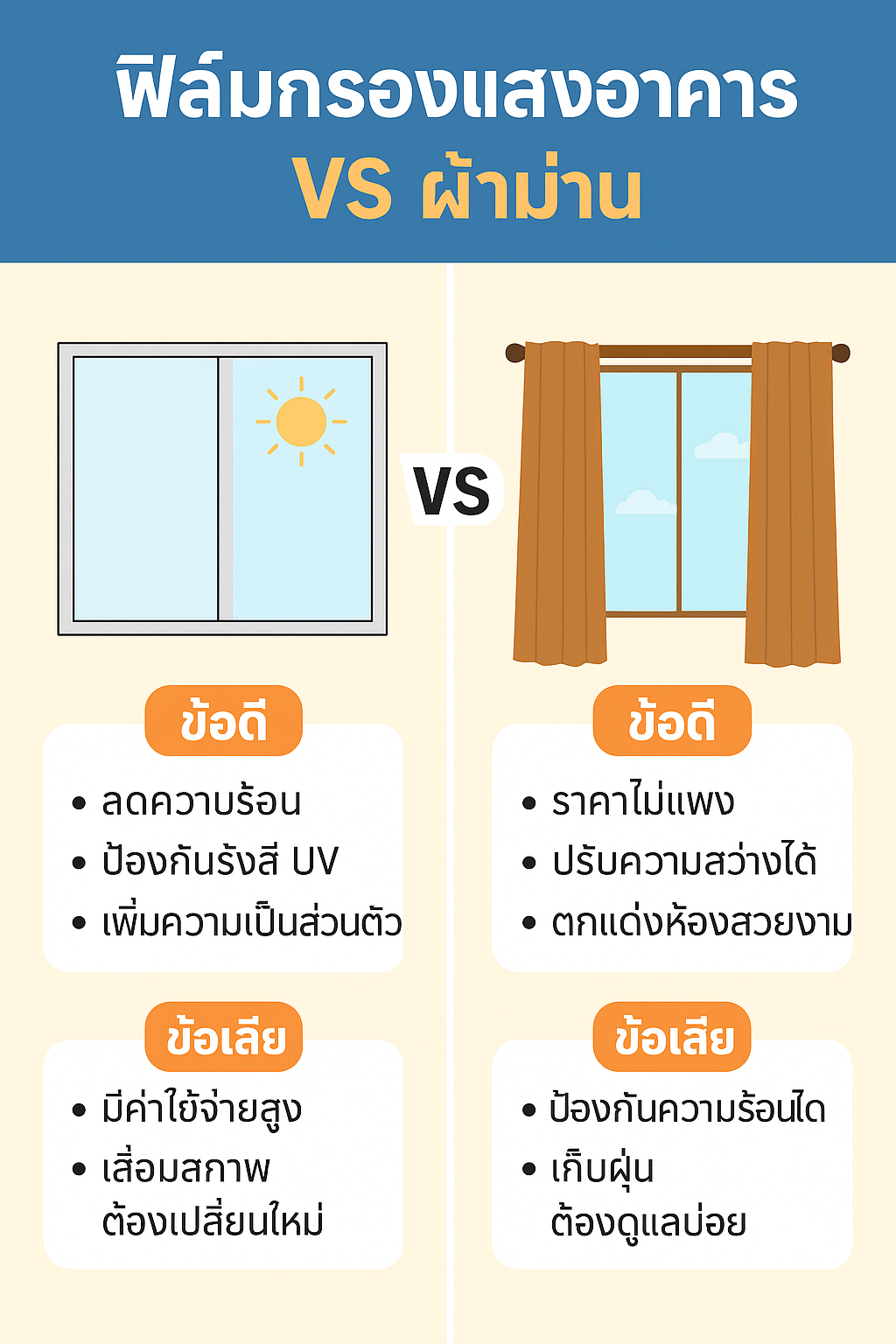 ถ้าต้องการกันความร้อนและ UV อย่างจริงจัง → เลือก ติดฟิล์มกรองแสงอาคาร จะตอบโจทย์มากกว่า